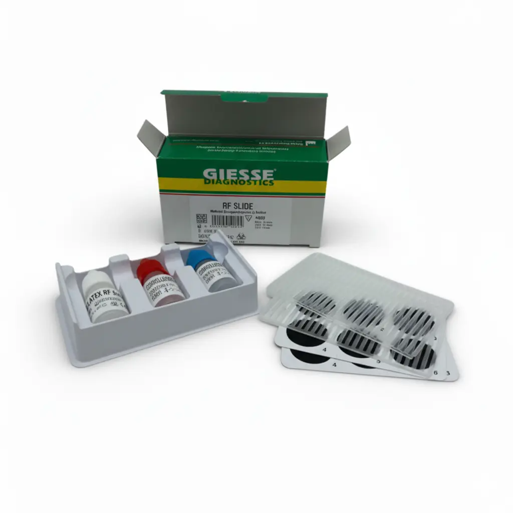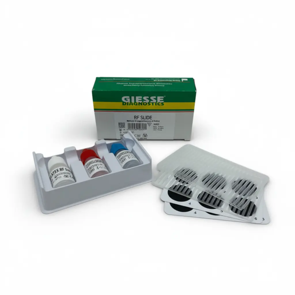 کیت RF SLIDE از برند معتبر ایتالیایی GIESSE DIAGNOSTICS، یک ابزار تشخیصی حیاتی و سریع برای شناسایی وجود فاکتور روماتوئید (RF) در نمونههای سرم انسانی است. RF یک اتوآنتیبادی مهم است که اصلیترین نشانگر آزمایشگاهی برای غربالگری آرتریت روماتوئید (RA) به شمار میرود.